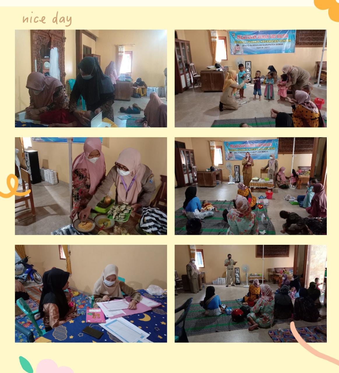 Kegiatan Pelayanan Rumah Gizi Balita dilaksanakan dalam rangka upaya pendampingan kepada balita dengan masalah gizi yang bertujuan untuk menurunkan angka stunting di kab. Demak. Kegiatan dimulai dari pendaftaran, Pengukuran BB dan PB dilanjut dengan Pemeriksaan fisik oleh Dokter dan penyuluhan oleh petugas Gizi dan Promotor. Kegiatan juga di Isi dengan Demo masak oleh kader dan bidan desa berupa Nugget ayam yang sudah di hitung nilai gizinya oleh petugas Gizi.