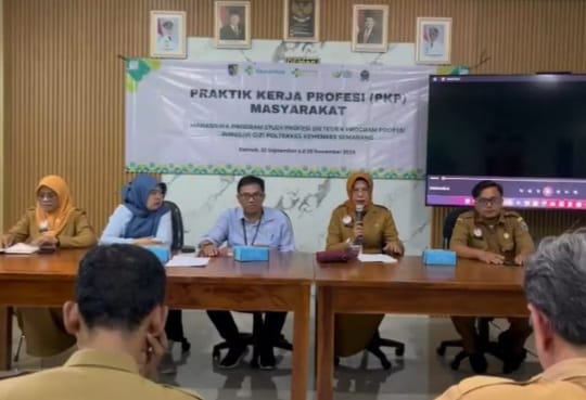 Dinkesda_Demak – Senin (22/9/2025), Aula Eks Keuangan Dinas Kesehatan Daerah (Dinkesda) Kabupaten Demak menjadi saksi pelaksanaan serah terima mahasiswa Pendidikan Profesi Dietisien dan Sarjana Terapan Kesehatan Gigi dari Poltekkes Kemenkes Semarang. Kegiatan ini dihadiri oleh jajaran pejabat Dinkesda, para kepala puskesmas, dosen pembimbing, serta mahasiswa peserta praktik kerja profesi dan praktik kerja lapangan tahun akademik 2025/2026.