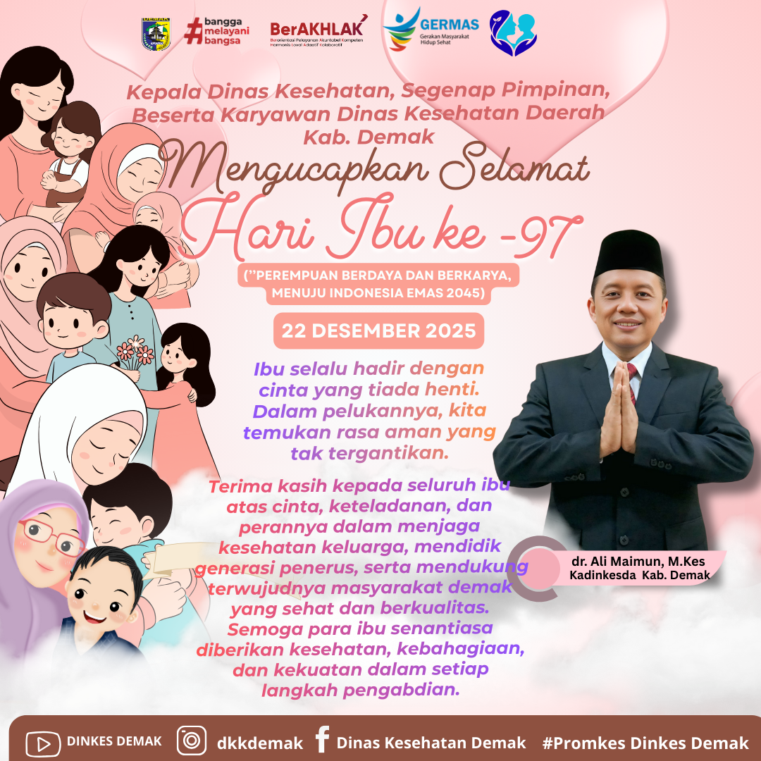 Dinkesda_Demak – Dalam rangka memperingati Hari Ibu ke-97 Tahun 2025 yang jatuh pada 22 Desember 2025, Dinas Kesehatan Daerah Kabupaten Demak menyampaikan apresiasi dan penghormatan setinggi-tingginya kepada seluruh ibu atas peran pentingnya dalam menjaga kesehatan keluarga, mendidik generasi penerus, serta mendukung terwujudnya masyarakat Demak yang sehat dan berkualitas.